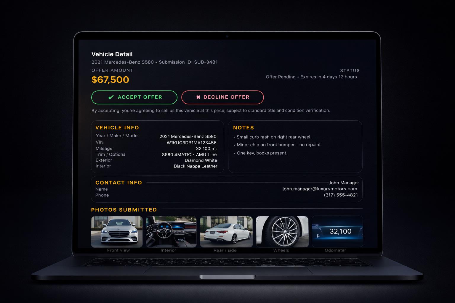 VIN, mileage, condition notes, and photos. Simple and fast.